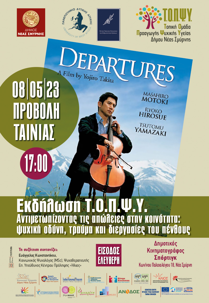 Προβολή της βραβευμένης με όσκαρ (ξενόγλωσσης) ιαπωνικής ταινίας “Αναχωρήσεις” (Departures, 2008) του Γιοτζίρο Τακίτα και συζήτηση γύρω από τη θεματική της απώλειας, ως αναπόσπαστη πτυχή του ταξιδιού της ζωής, αναδεικνύοντας τη σπουδαιότητα των τελετουργικών αποχαιρετισμού (ατομικών και συλλογικών), και εστιάζοντας στη σημασία της έννοιας του «ψυχικού χρόνου» απαραίτητου προκειμένου να περατωθεί η διεργασία του πένθους, στον Δημοτικό Κινηματογράφο Σπόρτιγκ στη Νέα Σμύρνη.
