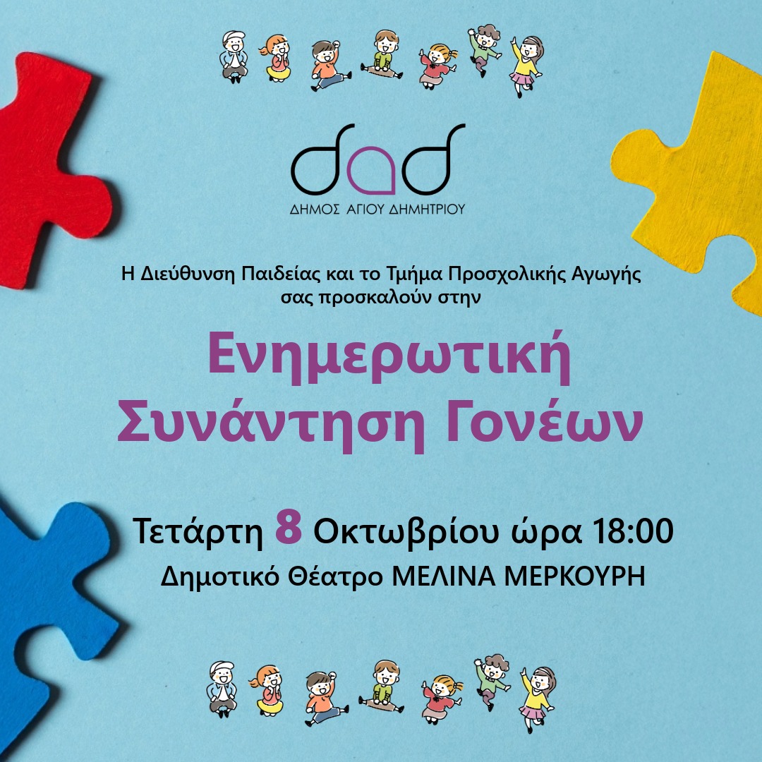 Η Διεύθυνση Παιδείας και το Τμήμα Προσχολικής Αγωγής του Δήμου Αγίου Δημητρίου, σας προσκαλούν σε “Ενημερωτική Συνάντηση Γονέων” στο δημοτικό θέατρο Μελίνα Μερκούρη (στο δημαρχείο Αγίου Δημητρίου) την Τετάρτη 8 Οκτωβρίου, στις 18:00.