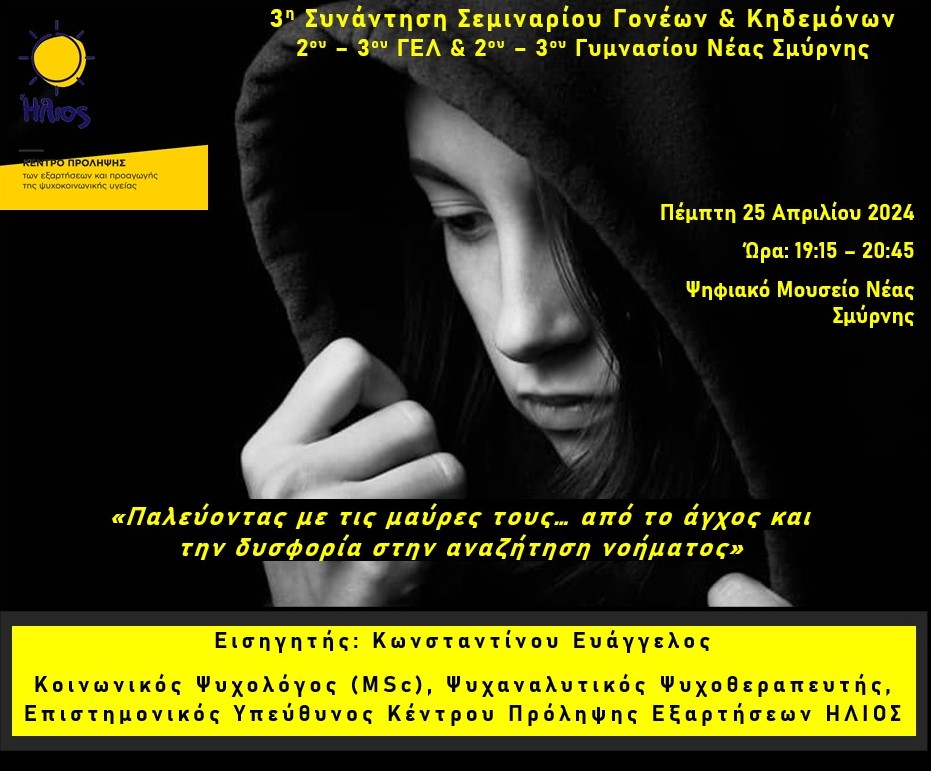 3η Συνάντηση του Κύκλου Σεμιναρίων Γονέων Εφήβων του Κέντρου Πρόληψης Εξαρτήσεων ”ΗΛΙΟΣ” στο Ψηφιακό Μουσείο της Νέας Σμύρνης (Ελ. Βενιζέλου 87).
