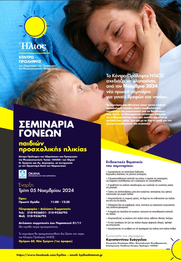 Νέος Κύκλος Σεμιναρίων Γονέων με παιδιά στην προσχολική ηλικία Κέντρου Πρόληψης Εξαρτήσεων ”ΗΛΙΟΣ”.