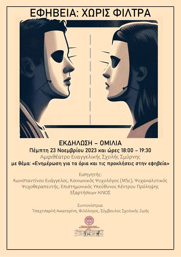 Την προσεχή Πέμπτη 23 Νοεμβρίου 2023 και ώρες 18:00 – 19:30 θα πραγματοποιηθεί ομιλία και συζήτηση με τους γονείς και τους παιδαγωγούς των Πρότυπων Γυμνασίου και ΓΕΛ Ευαγγελικής Σχολής Σμύρνης με θέμα: