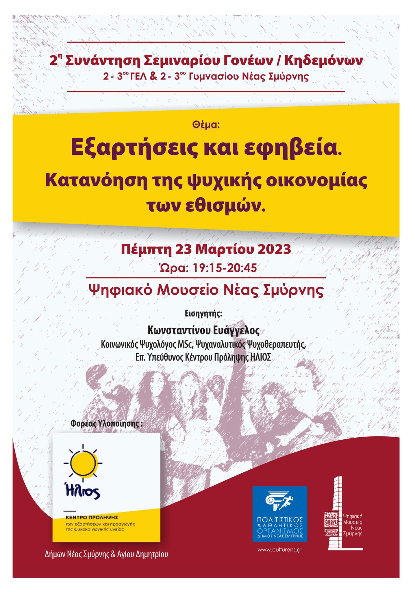 2η Συνάντηση την Πέμπτη 23 Μαρτίου 2023 & Ώρες 19:15 – 20:45 με θέμα: «Εξαρτήσεις και εφηβεία. Κατανόηση της ψυχικής οικονομίας των εθισμών».