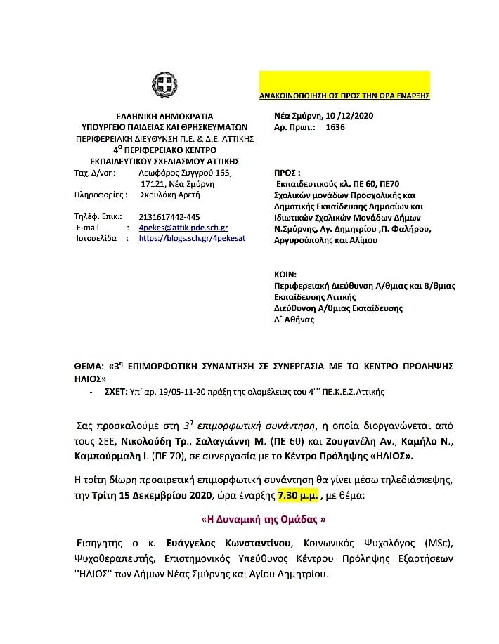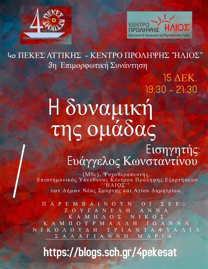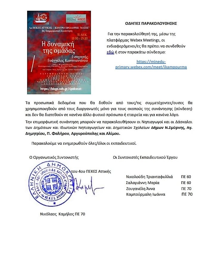 Την προσεχή Τρίτη 15 Δεκεμβρίου 2020 και ώρα 19.30μ.μ. θα πραγματοποιηθεί η 3η δίωρη επιμορφωτική συνάντηση για Νηπιαγωγούς και Δασκάλους, στο πλαίσιο της συνεργασίας του Κέντρου Πρόληψης ”ΗΛΙΟΣ” με το 4ο ΠΕ.Κ.Ε.Σ. Αττικής, μέσω τηλεδιάσκεψης (webex), με θέμα:
